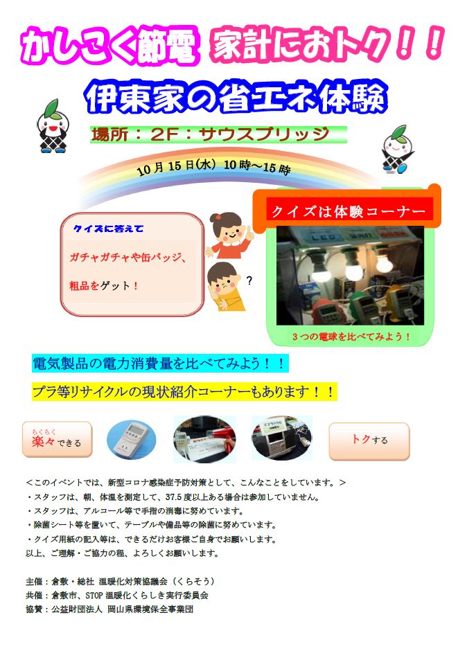 イオンモール倉敷(2F:サウスブリッジ)で伊東家の省エネ体験(10月)を開催します!