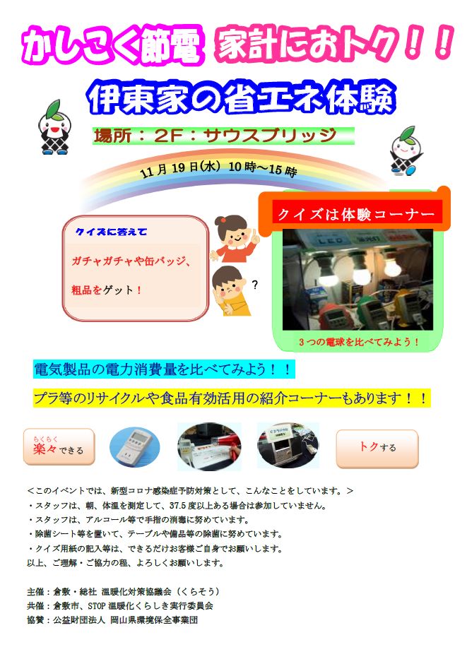 イオンモール倉敷(2F:サウスブリッジ)で伊東家の省エネ体験(11月)を開催します!