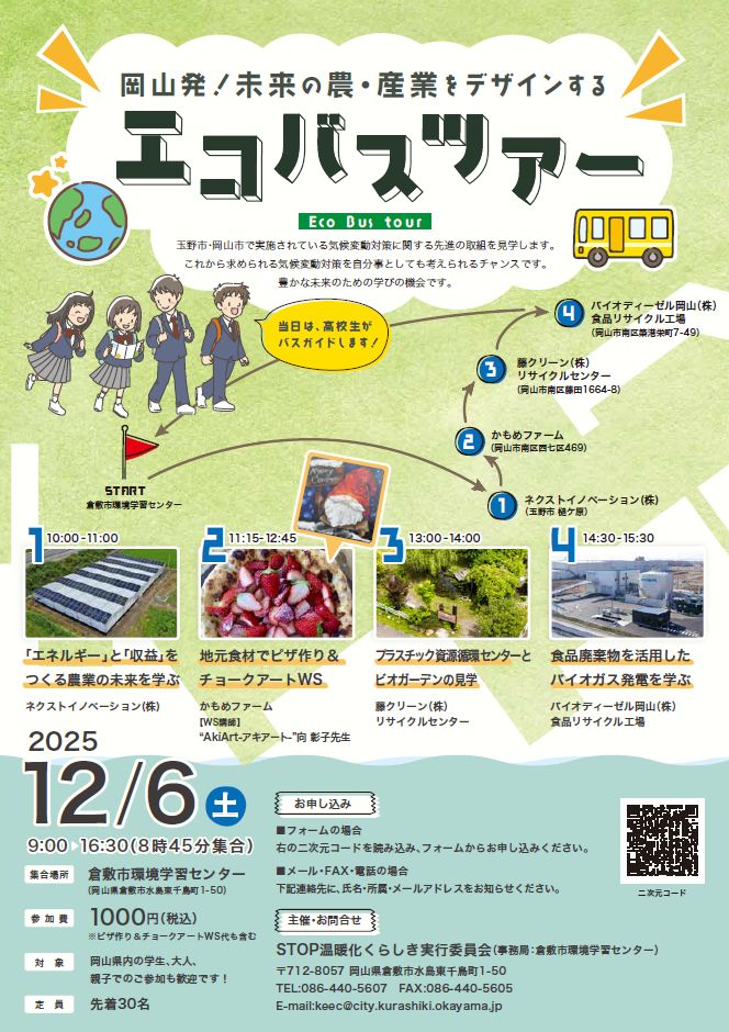 イベントを体験した方には、粗品を、また子供さんには、ガチャガチャで当たる素敵な景品をプレゼント!さらに、STOP温暖化くらしき実行委員会のメンバーでもある「おかやまコープ」による『エコクッキング・レシピの配布』も予定しています。